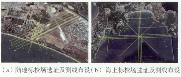 為了校正9個通道各自的安裝角偏差,需要分別布設陸地標校場和海上標校場各1個。陸地標校場標校陸地通道和淺水通道的安裝角偏差,海上標校場標校淺水通道和深水通道的安裝角偏差。標校場選擇及測線布設情況見圖5。