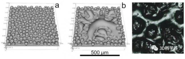 圖 6. 模擬(a)使用直徑為 50 μm 的單層粉末,(b)激光曝光后和(c)實驗結(jié)果的光學(xué)圖像(以與模擬相同的比例顯示,即相同的比例尺)使用50 μm 厚的一層中含有 54 μm 的粉末。? Science Direct