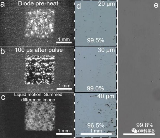 圖 7. 使用 27 μm 直徑粉末、30 μm 層厚的單層打印(4600 W/cm2、8 ms、~26 J/cm2、10 ns–100 μs(脈沖長度 Seurat 專有))。(a) 散布的粉末層光滑,沒有大的缺陷,導(dǎo)致 (b) 光滑的打印層(暗區(qū))。(c) 整個貼片的液體運動相對均勻。顯示了使用三個獨立層厚度 (d) 的構(gòu)建,突出顯示了使用較厚粉末層時產(chǎn)生的缺陷。使用 20 μm 厚的層,達(dá)到的密度為 99.5%。熔體工藝的進(jìn)一步優(yōu)化 (e) 隨后能夠始終如一地實現(xiàn)超過 99.8% 的密度。? Science Direct