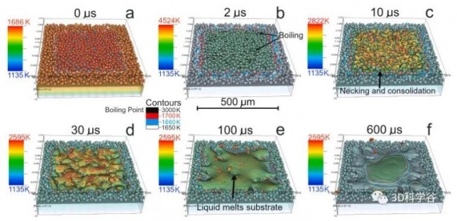 圖 3. ALE3D 模型顯示了 ~26 J/cm2 熔化脈沖(10 ns–100 μs(脈沖長度 Seurat 專有))動力學(xué)的不同階段。50 μm 厚的直徑為 35 μm 的粉末顆粒層用作起始層。粉末顆粒的頂部在 2 μs (b) 時達(dá)到沸騰溫度,此后立即發(fā)生聚結(jié)。液體運動基本上在 100 μs (e) 時完成。凹坑缺陷此時形成但稍后固化。隨著凝固的繼續(xù),由于表面張力和流體流動將液體吸入中心 (e, f),在液體中心開始形成山丘型缺陷。? Science Direct