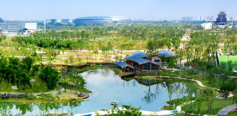 特別值得一提的是,公園專門設計了連通東安湖公園、可以向南延伸至龍泉山城市森林公園、向北銜接大運會主場館片區的慢行綠廊。該綠廊長120米、寬70米,通過架設蓋板的方式,上跨環湖南路,該綠廊不僅可供人行通過,也為動物遷徙提供了通道,是大運會片區生態修復的重要一環。