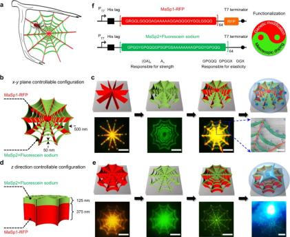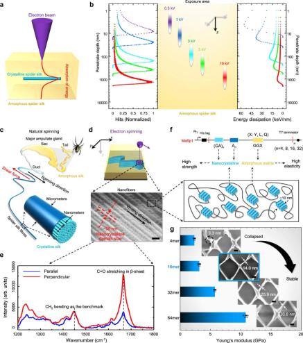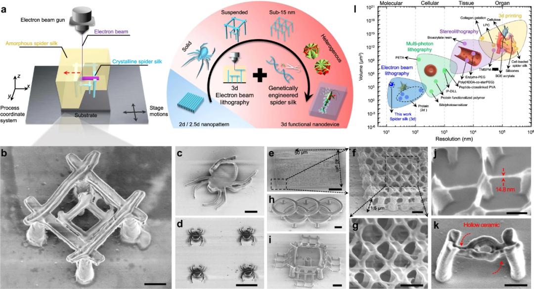 通過基因工程重組蜘蛛絲蛋白,可以在納米尺度上創(chuàng)建任意高分辨率、高強度的三維結構。通過在 3D 蛋白質基質不同深度使用高能電子定量定義結構轉變的能力,可以使多態(tài)性蜘蛛絲蛋白質接近分子水平。此外,蜘蛛絲蛋白的遺傳或介觀修飾提供了將物理化學、生物功能嵌入和穩(wěn)定在所制備的三維納米結構中的機會。該研究所用方法能夠快速靈活地制造異質功能化和分層結構的 3D 納米組件和納米設備,為仿生學、治療設備和納米機器人提供了機會。