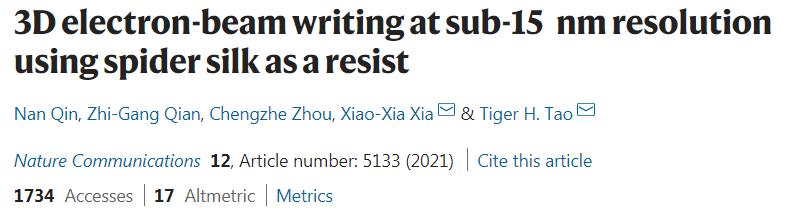 具體而言,該研究團隊創(chuàng)新開發(fā)了基因重組蜘蛛絲蛋白光刻膠,通過優(yōu)化重組蜘蛛絲基因片段和分子量,結合基于百萬級數量電子的大規(guī)模仿真模擬,實時控制加速電壓調控電子在絲蛋白光刻膠里的穿透深度、停留位置和能量吸收峰,實現了分子級別精度的真三維納米功能器件直寫。該技術加工精度可達 14nm,接近天然絲蛋白單分子尺寸(~10 nm),較之前技術提升了 1 個數量級。