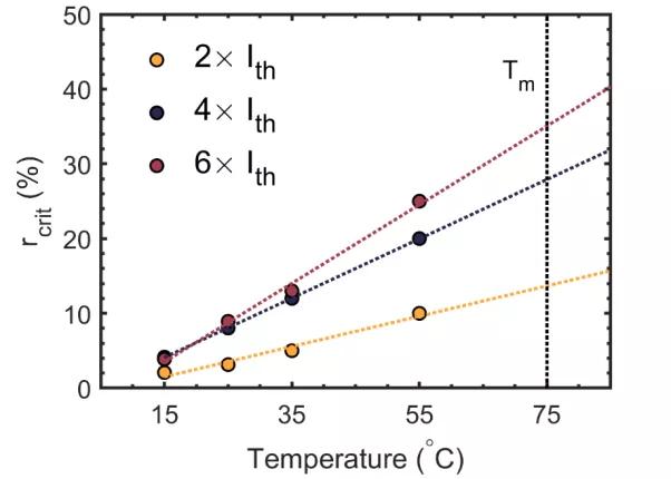 研究顯示,隨著溫度升高而降低的波長失配顯著提升了激光器在外部光學反饋條件下的失相干(coherence collapse)抑制效果。如圖3所示,使激光器進入失相干狀態的光反饋強度閾值(critical feedback level)隨著溫度的升高而明顯上升。在四倍閾值電流及55°C的操作條件下,該激光器可承受最高25%(-6 dB)的光反饋強度并保持穩定狀態, 且激光器的性能及對外部光學反饋的耐受度會在75°C達到最佳效果。