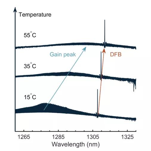 圖2 單模量子點激光器在不同工作溫度下的光譜變化。由于布拉格波長(DFB,紅色)和光學增益波長(gain peak,青色)隨溫度的升高而顯示出不同的變化速率,二者間的波長失配程度將在75°C時達到最低。