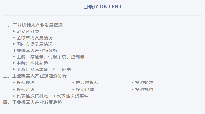 近日,清科創業(01945.HK)旗下清科研究中心研究發布《2021年中國工業機器人產業投融資分析報告》,報告通過分析國內外工業機器人市場規模和競爭格局,梳理產業鏈圖譜,對減速器等核心零部件、本體制造、系統集成及應用等市場情況及代表性廠商進行深入研究;股權投資方面,從投資規模、輪次、階段、機構類型等多維度展開分析,并對工業機器人產業的發展動態及趨勢進行預測等。