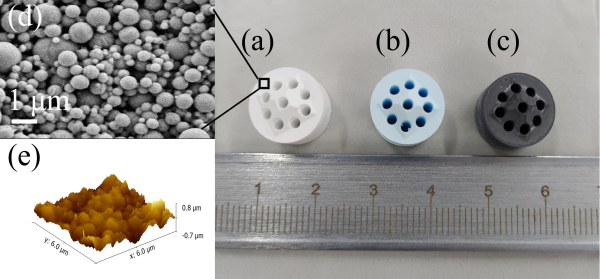 3D打印催化劑。(a):DLP-3D 打印后的基底載體,(b):浸漬干燥結晶后的樣品,(c):煅燒后的樣品,(d)(e):樣品的SEM圖像和原子力顯微鏡表面形貌