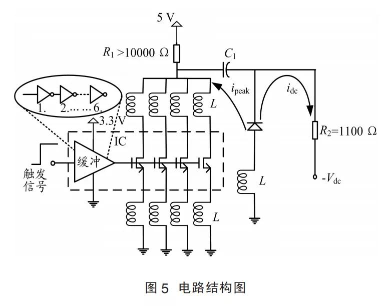 2008 年,中國科學(xué)院的張壽棋等人[27]研制了脈寬為 10 ns、峰值電流為 20 A 和重復(fù)頻率為 1 MHz 的連續(xù)可調(diào)脈沖, 該驅(qū)動(dòng)電路通過雙晶體管構(gòu)成推挽輸出,形成常開常閉門對(duì)管驅(qū)動(dòng)高速 MOSFET,有效提高了帶負(fù)載能力,其供電電源電壓只需 30 V,解決了大電壓、大功耗的問題。為了獲得更低功耗的驅(qū)動(dòng)電路,2009 年,NISSINEN J 等人[28]提出了一種 CMOS 電流脈沖 發(fā) 生器,其電路結(jié)構(gòu)圖如圖 5 所示,該發(fā)生器采用0.35 μm 的 CMOS 工藝, 由 4 個(gè)平行的 n 型金屬氧化物半導(dǎo)體晶體管組成,通過縮放驅(qū)動(dòng)緩沖鏈實(shí)現(xiàn)快速切換,獲得了脈沖峰值為 1 A、上升時(shí)間小于 1 ns 和脈沖寬度為 2.5 ns 的高速電流脈沖。這些步進(jìn)式控制信號(hào) 和簡單的脈沖整型技術(shù)的供電電壓低至 5 V,功耗極低。
