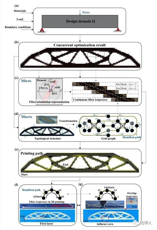 CFRTPCs的多尺度設計制造策略如圖1所示,以MBB梁為例進行說明。考慮到連續纖維復合材料的各向異性特性,基于復合材料本構模型與特定工況條件,對纖維取向和結構拓撲進行了并行優化,獲得了具有宏觀拓撲幾何特性和微觀單元最優纖維取向的并行優化結果。為保證纖維軌跡的連續性,對并行優化結果中的離散單元纖維取向進行了修正。同時,提出了一種基于哈密頓路徑的纖維軌跡設計方法,為3D打印路徑規劃提供了指導。最后,基于以上方法生成具有連續纖維軌跡的3D打印路徑,實現了CFRTPCs各向異性的優勢,滿足了3D打印工藝的要求。