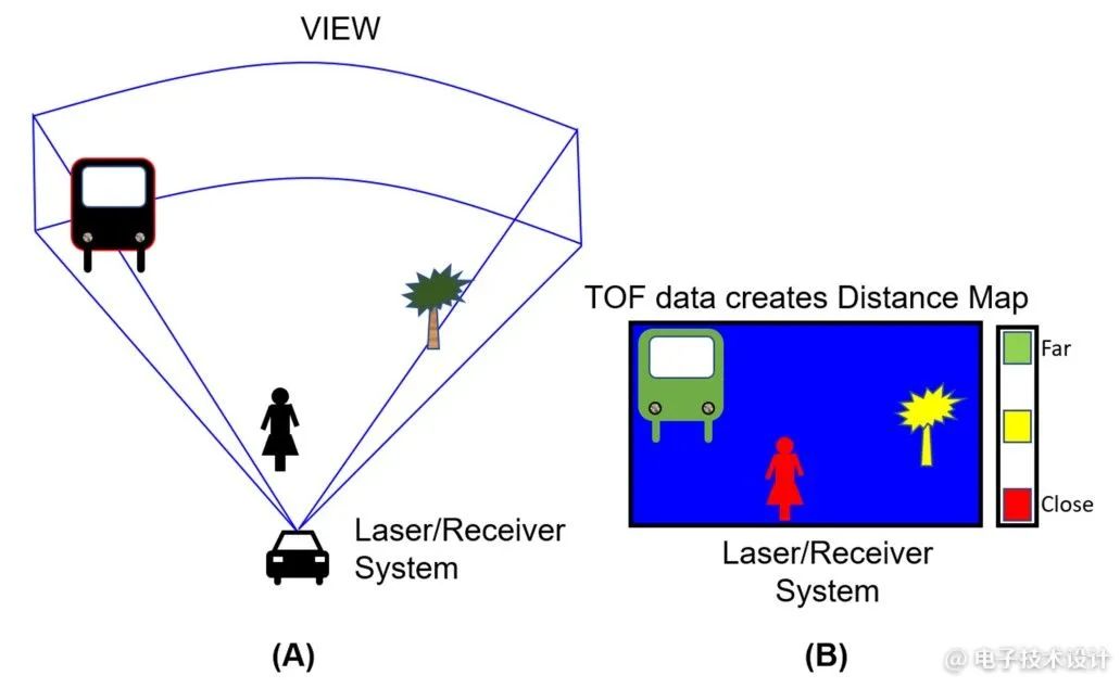 激光雷達(dá)系統(tǒng)的基本要素包括方波發(fā)射系統(tǒng)、目標(biāo)環(huán)境,以及用來(lái)解釋環(huán)境中外部元素距離的光接收器系統(tǒng)。激光雷達(dá)傳感方法是采用脈沖激光形式的光,通過(guò)分析返回信號(hào)的飛行時(shí)間(ToF)來(lái)測(cè)量范圍的(圖2)。