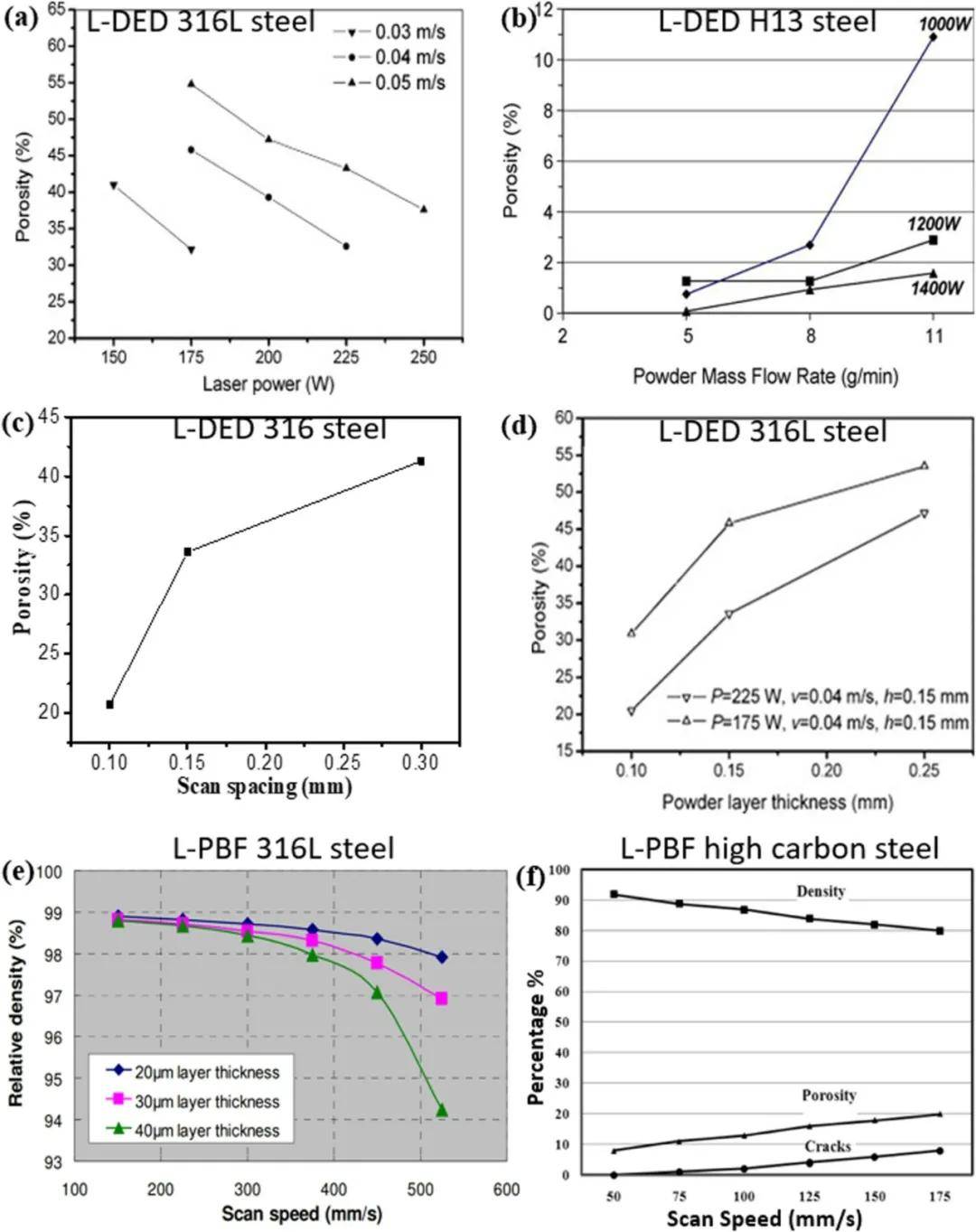 圖6 工藝參數對L-PBF和L-DED制備的鋼試樣氣孔率的影響:(a)激光功率;(b)粉進料速度;(c)掃描間距;(d)涂層厚度和激光功率;(e)掃描速度和層厚;(f)掃描速度