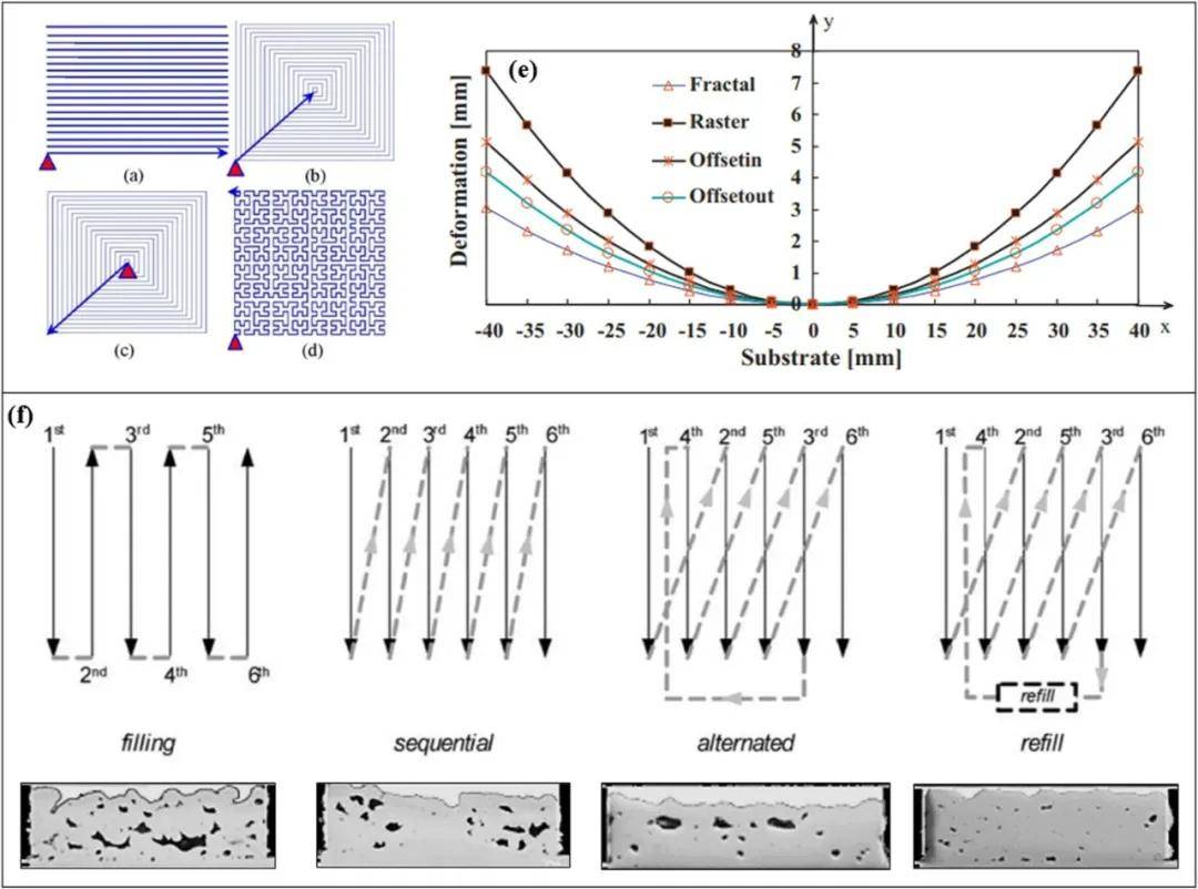 目前,傳統的行掃描仍是LAM過程中最常用的掃描策略,也被稱為交替掃描、光柵掃描和鋸齒掃描。其他新型掃描策略(分形掃描、螺旋掃描和島狀掃描)被開發出來,以降低LAM(通常為106 K m-1)期間由陡峭的熱梯度引起的部分的應力和應變。它們對構件變形和殘余應力的影響已被廣泛報道和比較。如Yu等研究并比較了掃描模式(光柵、偏移和分形,見圖13(a-d))對L-DED建造的316L零件變形的影響。如圖13(e)所示,分形沉積模式在零件中產生的變形最小,其次是偏移偏移模式(即螺旋掃描)。將實驗結果與有限元建模(FEM)相結合,Yu等人發現,在L-DED過程中,瞬態溫度梯度的大小對零件變形具有關鍵影響。有限元分析結果表明,分形和偏置沉積模式比光柵和偏置沉積模式的溫度梯度更小,導致零件變形更小。