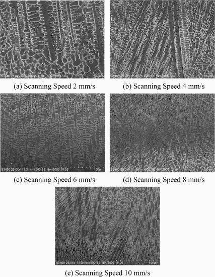只需改變掃描速度,其他加工參數(激光功率1000 W,送粉速度4g/min,光斑直徑2 mm)保持不變。不同掃描速度下熔覆層的SEM形貌如上圖所示。圖(a)、(b)、(c)、(d)、(e)依次為掃描速度為2、4、6、8、10 mm/s時的顯微組織。