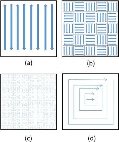 (a)鋸齒形(b)島形(c)分形和(d)螺旋掃描策略示意圖。