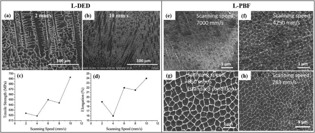 圖11 (a,b)不同掃描速度下L-DED沉積的316L合金的SEM組織,(c)抗拉強度和(d)延伸率[93];(e-h)用不同的激光掃描速度對l - pbf316l樣品的蝕刻表面進行SEM掃描。