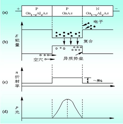 (a) 雙異質(zhì)結(jié)構(gòu);(b) 能帶;(c) 折射率分布;(d) 光功率分布