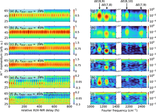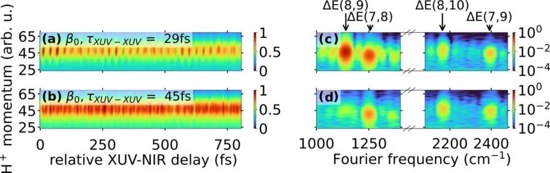 H+離子被鎖相脈沖XUV阿秒脈沖對電離后的動量作為近紅外激光脈沖的延遲函數(a), XUV-XUV延遲29 fs,對應于振動波包的相干激發。(b)當XUV-XUV時延為45 fs時,系統處于糾纏狀態。通過對延遲掃描數據進行傅里葉變換,可以識別出(c)+(d)單個振動量子拍。關鍵的是,對應于最近鄰居相干的峰值強度(?E8、9和?E(7,8))在XUV-XUV延遲29 fs的測量中非常明顯,而在XUV-XUV延遲45 fs的測量中非常微弱。來源:Fig. MBI