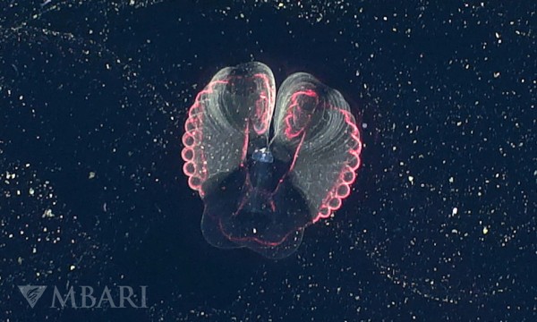 圖 1:Bathochordaeus stygius,一個巨大的幼蟲,在它的粘液房中,被 DeepPIV 激光片照亮。版權(quán)所有 Kakani Katija / MBARI。