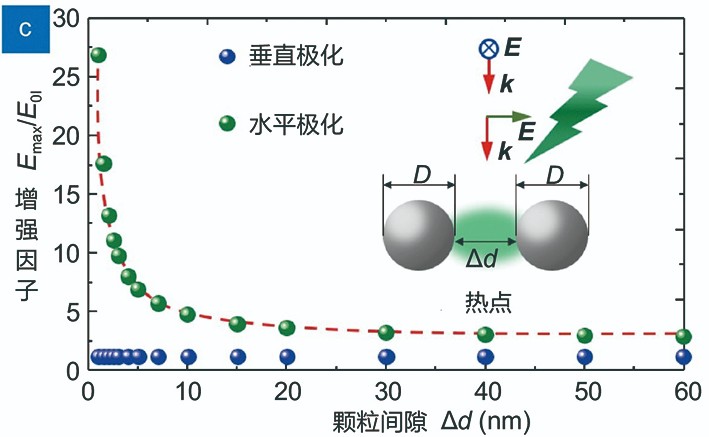 圖3:等離子體增強電場作為平行和垂直于粒子間軸的光偏振方向的粒子間間隙的函數