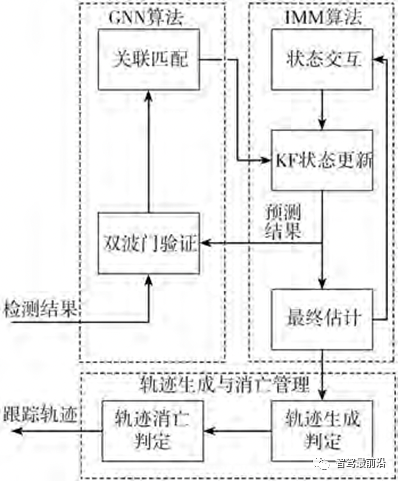 本文中提出的基于激光雷達(dá)的3D實(shí)時(shí)車輛跟蹤系統(tǒng),由3個(gè)部分組成:(1)使用雙波門GNN的前后幀目標(biāo)關(guān)聯(lián)模塊;(2)使用3DKF實(shí)現(xiàn)的IMM跟蹤濾波器;(3)結(jié)合歷史軌跡信息的跟蹤軌跡生成和消亡管理器。其整體系統(tǒng)流程如圖1所示。