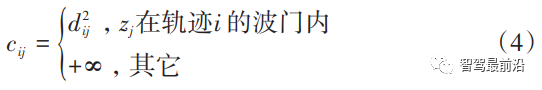 對(duì)于關(guān)聯(lián)距離的計(jì)算方式,文獻(xiàn)[11]和文獻(xiàn)[12]中選用歐式距離進(jìn)行計(jì)算。歐氏距離計(jì)算方便,直接反映了兩個(gè)物體間的空間距離。然而歐式距離對(duì)關(guān)聯(lián)向量中的各個(gè)參數(shù)進(jìn)行等權(quán)重的計(jì)算,無法評(píng)判不同參數(shù)的不同重要性,因此本文中選用以協(xié)方差作為權(quán)重的馬氏距離進(jìn)行計(jì)算[19],從而能更好區(qū)分目標(biāo)間的相似度。