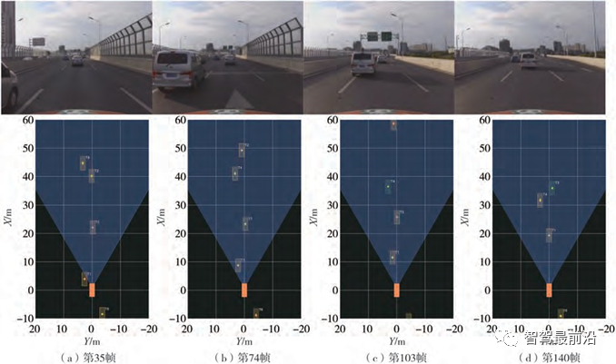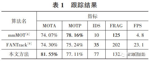 使用在訓(xùn)練數(shù)據(jù)中劃分出來的驗(yàn)證集對(duì)算法性能進(jìn)行驗(yàn)證,其結(jié)果如表1所示。由表1可知,在主要的跟蹤指標(biāo)MOTA上對(duì)比算法mmMOT與FANTrack高了7%,而在MOTP與FRAG指標(biāo)上較最好的mmMOT算法差距并不大,僅在IDS指標(biāo)上效果較差。在這樣的結(jié)果下,本文中算法實(shí)時(shí)性達(dá)到266.1FPS,比FANTrack算法快了11.5倍,比mmMOT算法快55.4倍,所提出的跟蹤算法完全滿足智能駕駛實(shí)時(shí)性的需求。