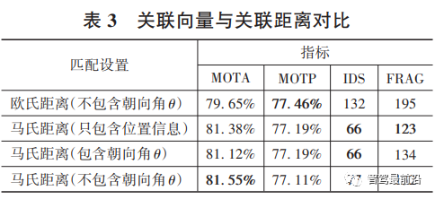 對(duì)關(guān)聯(lián)向量與關(guān)聯(lián)距離的不同設(shè)置進(jìn)行對(duì)比,其結(jié)果如表3所示。從表3中第1組與第4組對(duì)比可以看出,馬氏距離可以實(shí)現(xiàn)更高的MOTA精度。馬氏距離可以更好地描述關(guān)聯(lián)向量不同信息間的重要程度,使得對(duì)目標(biāo)間距離的評(píng)價(jià)更加準(zhǔn)確。而后3組的實(shí)驗(yàn)對(duì)比顯示了單純的增大關(guān)聯(lián)向量維度并不能帶來MOTA精度的提高。第2組與第4組對(duì)比可以看出目標(biāo)3D體積信息的添加對(duì)關(guān)聯(lián)是有益的。而第3組與第4組對(duì)比,朝向角θ的加入,并不能提高M(jìn)OTA精度。本文中認(rèn)為3D檢測(cè)算法對(duì)目標(biāo)的朝向角敏感度較低,對(duì)于同一目標(biāo)在不同幀中的檢測(cè)結(jié)果,其朝向角大小可能會(huì)發(fā)生180°的突變。朝向角發(fā)生180°突變,其檢測(cè)框位置不會(huì)發(fā)生變化,然而3D跟蹤的關(guān)聯(lián)距離會(huì)產(chǎn)生較大的變化,從而導(dǎo)致關(guān)聯(lián)失敗,因此在關(guān)聯(lián)向量中去除朝向角θ信息反而能帶來MOTA精度的提高。