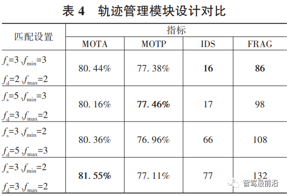 在軌跡管理模塊中對(duì)比了不同的fs與fmin、fd與fmax參數(shù)值對(duì)精度的影響,其結(jié)果如表4所示。對(duì)比表4后3組實(shí)驗(yàn)可知,增大對(duì)歷史軌跡的判斷范圍,即使軌跡生成和消亡的總體判定比fmin/fs與fmax/fd從2/3下降到3/5,仍可減小IDS與FRAG。而在合適的fs與fd設(shè)置下,將fmin/fs與fmax/fd升至1,如第1組實(shí)驗(yàn),即可獲得最小的IDS與FRAG。