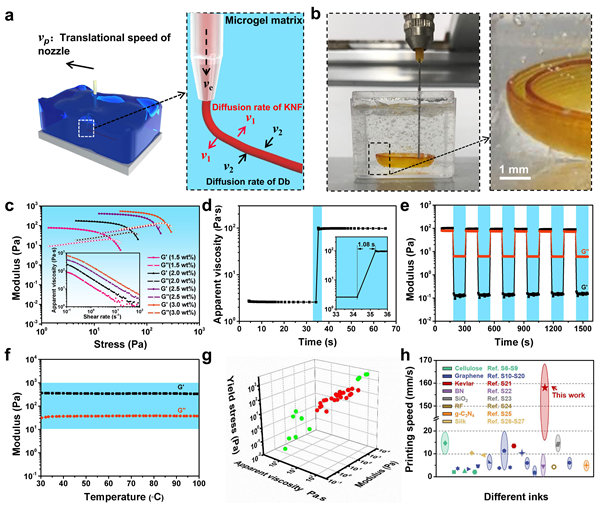 在MSP策略實施過程中,沉積在微凝膠基質中的KNF墨水立即進行部分溶膠-凝膠轉變,基質可臨時支撐未完全凝膠化的KNF線條直至其完全凝膠老化。研究發現,利用二甲基亞砜(DMSO)和卡波姆(Carbopol)的分散-質子化凝膠作用,以及1,4-二溴丁烷(Db)的化學交聯作用,Db可在KNF的氮負離子位點進行取代反應,從而在相鄰KNF線條間形成共價烷烴鍵,促進相鄰KNF打印線條之間的粘附力,進而保證結構的完整性。此外,在針頭直徑一定的情況下,墨水的擠出速率(νe)、針頭的移動速率(打印速度,νp)、基質中KNF(ν1)和Db(ν2)的雙擴散速率共同影響著KNF打印線條的形態和直徑。由于MSP策略中微凝膠基質的輔助作用,擠出打印方法對墨水的流變性要求不嚴格,打印速度大大提高(高達167 mm s-1),遠高于文獻報道的打印速度(通常小于20 mm s-1),提高了制備效率。
