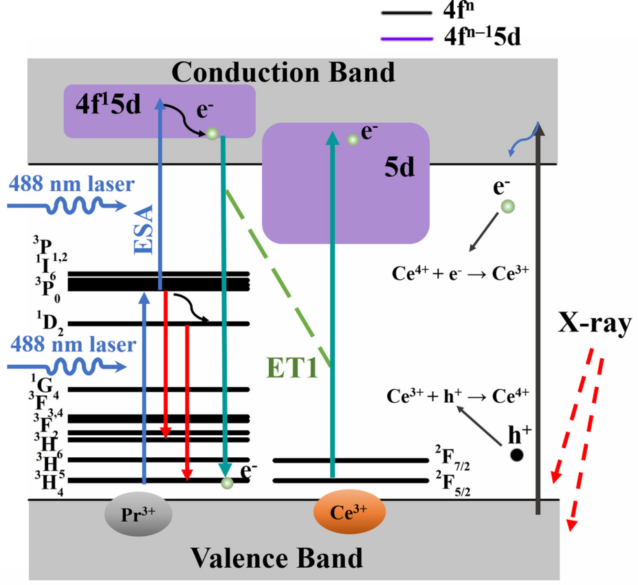 Ce3+離子與Pr3+離子在4f5d能級上的能量傳遞示意圖