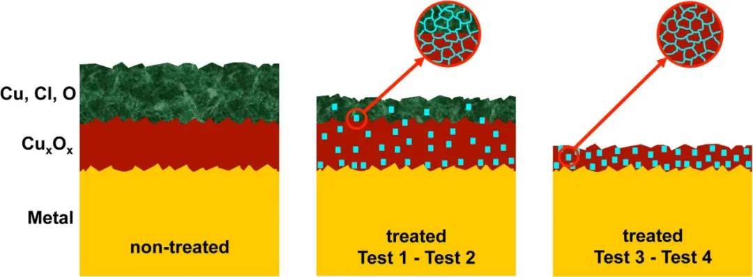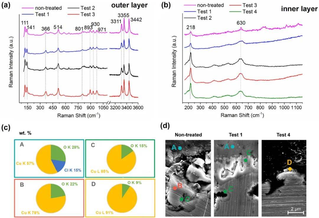 由于這些原因,通過EDS分析,內(nèi)層中存在的化合物被確定為Cu和O的混合物,具有不同的百分比(赤銅礦/黑鐵礦/共晶點),可能主要包含赤銅礦,因為這是拉曼光譜檢測到的唯一相。這可能表明該層結晶度差,影響μ拉曼結果,以及未處理樣品上存在的銅和氧含量不均勻。然而,由于試驗4中的再氧化現(xiàn)象,未排除偶爾形成一層銅礦。