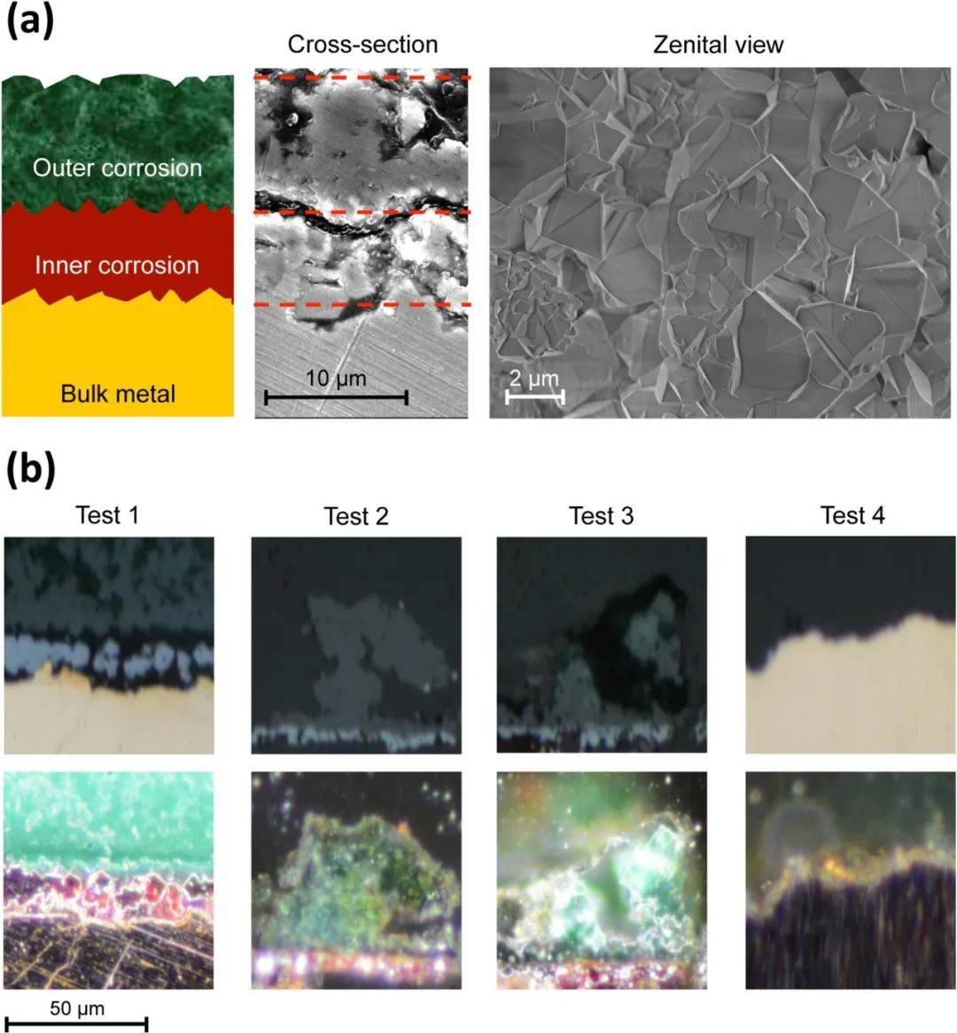 圖2 (a)人工腐蝕層的橫截面圖和對應于腐蝕產(chǎn)物橫截面的FESEM圖像;右邊是外層表面的zenitalFESEM圖像。(b)激光清洗試驗后橫截面的OM圖像。