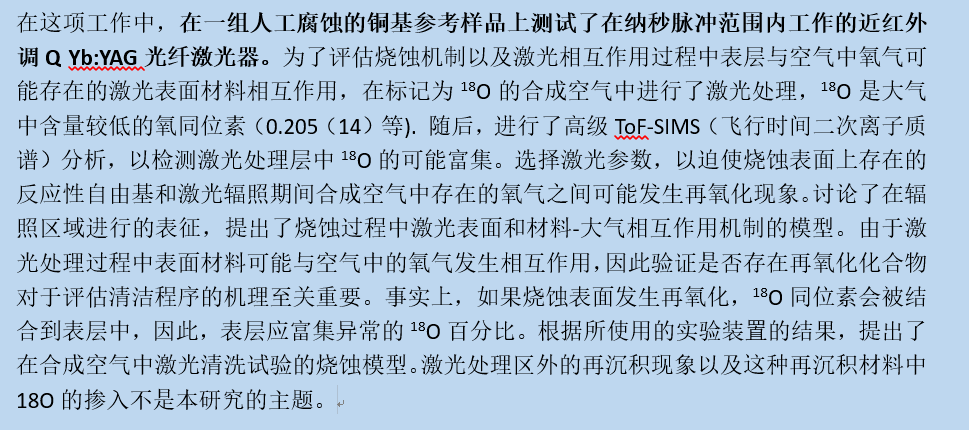 然而,在消除金屬上的腐蝕層期間,特別是激光誘導去除銅基合金上的腐蝕產(chǎn)物的文獻中,關于激光與表面材料相互作用的信息有限。例如,Zhang和他的合作者報告說,在鋁合金上,激光燒蝕能夠去除原始的、保護性較弱的鈍化層,形成保護性更強的層。