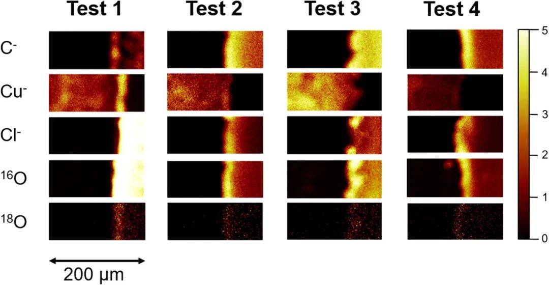 ToF-SIMS分析表明,在整個腐蝕層被燒蝕的情況下,氧在腐蝕層深處被加入了幾個微米,甚至到達了本體表面。在這些情況下,結果將形成一層銅,如μ拉曼光譜觀察,厚度為幾微米。這一觀察結果只有增加激光照射條件的清洗過程以上的優(yōu)化(測試1)。