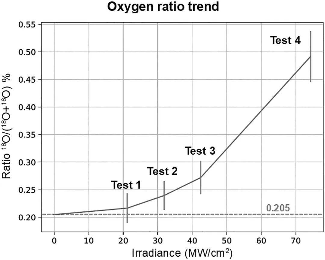 圖6給出了再氧化效應如何發(fā)生的示意圖。在激光照射后,燒蝕區(qū)(激光束區(qū)域下方)已包含18O,無論移除層的深度如何。激光處理區(qū)域周圍重新沉積的材料也可能會出現(xiàn)18O的摻入,這可能是在激光燒蝕過程中發(fā)生的(不是本實驗的主題)。