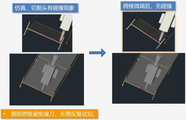 對于鋼結構行業中較常用到的工字鋼、C型鋼等WiseCAM提供了跨棱微調功能,操作簡易,降低用戶使用門檻,在跨棱的位置提前偏轉切割角度,另加工更加安全平滑。