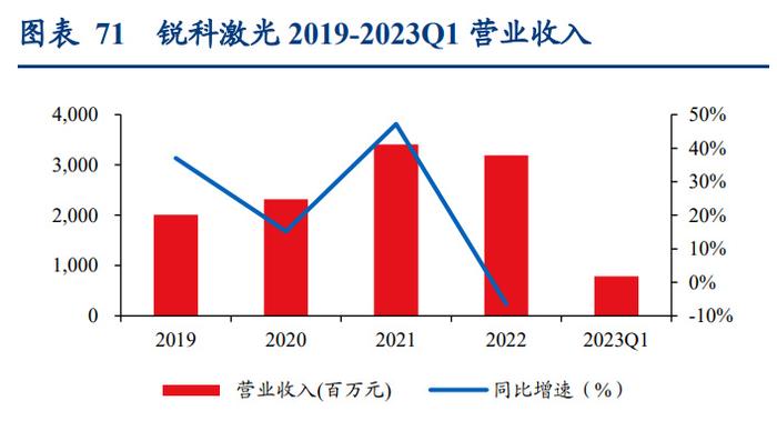 公司是一家專業從事光纖激光器及其關鍵器件與材料的研發、生產和銷售的國家火炬計 劃重點高新技術企業,是全球有影響力的具有從材料、器件到整機垂直集成能力的光纖 激光器研發、生產和服務供應商;主營業務包括為激光制造裝備集成商提供各類光纖激 光器產品和應用解決方案。2019-2022 年,公司營收從 20.10 億元增長至 31.88 億,CAGR 為 16.62%。2019-2022 年凈利潤分別為 3.25 億元、2.96 億元、4.74 億元及 0.40 億元。