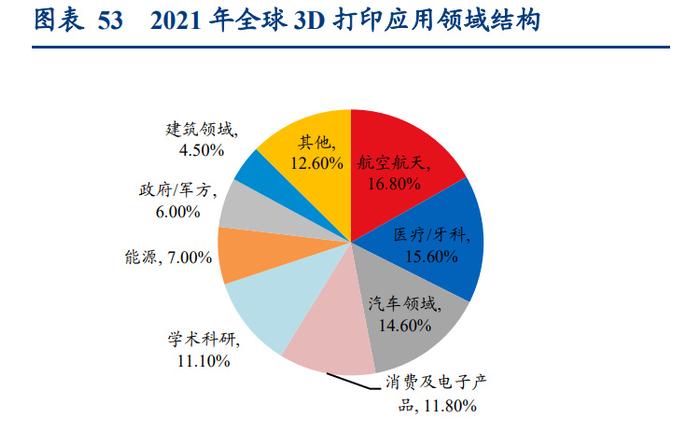 3D 打印主要應用于航空航天、醫療、汽車及消費電子等領域。隨著 3D 打印的優勢不斷 被發掘,應用場景在不斷深化,在各行各業均得到了越來越廣泛的應用。目前,3D 打印 主要應用于航空航天、醫療、汽車等領域,也就是在制造業和醫療領域應用最為廣泛。 根據 Wohlers Associates,2021 年全球 3D 打印應用領域結構中航空航天行業份額占比為 16.8%,為 3D 打印行業下游的主要應用領域,醫療/牙科領域,占比為 15.6%,汽車領域 占比為 14.6%。由于航空航天、醫療、汽車等領域對零部件質量和定制化的要求較高,我 國 3D 打印的應用領域主要集中在這些領域。