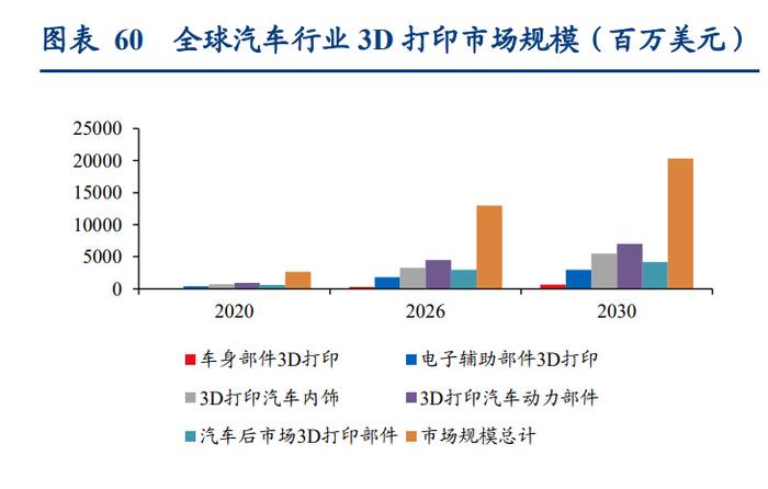 預計 2026 年全球汽車行業 3D 打印市場規模將達到 129 億美元。根據 VoxelMatters (formerly 3dpbm)發布的《3D 打印在汽車行業的應用市場報告》,預計全球汽車行業市 場規模將從 2020 年的 26.78 億美元增長到 129 億美元,復合增長率為 25.28%。汽車主要 由四個部分組成:車身、電子附件、內飾和動力部件,其中汽車動力部件的市場規模占 比最大,2020 年占比為 35.29%。