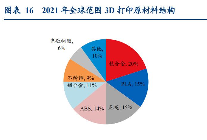 金屬粉末:金屬粉末在工業領域應用較多,市場空間廣闊。金屬粉末有鈦合金、高溫合 金、鎳鉻合金、銅鋁合金等,可以生產形狀復雜,個性化的零部件,并且可以顯著縮短工 件的生產周期,提高材料的利用率,產品附加值高,增長潛力大,所以被廣泛應用于航 空航天,醫療器械等場景。