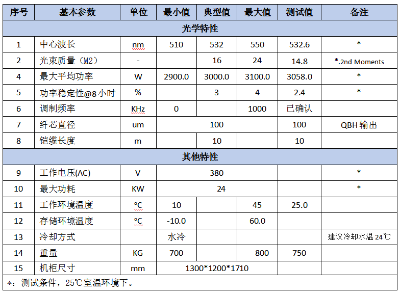 公大激光3000W多模連續綠光測試部分數據 產品PN: GCL-3000-B-I-W