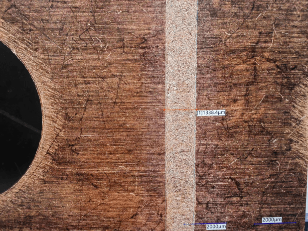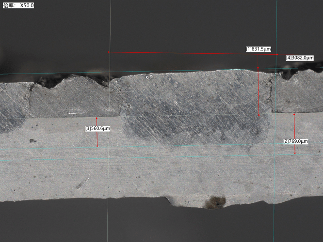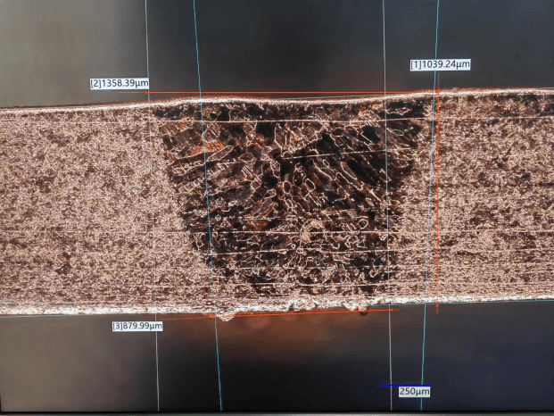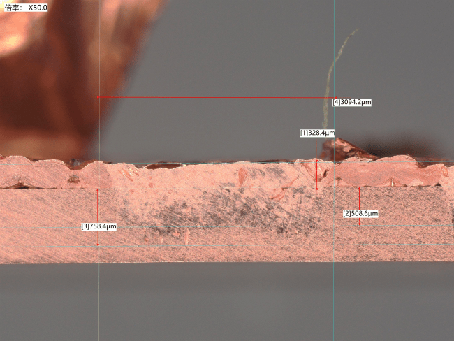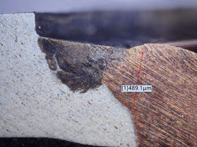 (5)多層極耳與方殼電池極柱焊接,焊接方式:銅箔-銅 疊焊,焊材:50層負極耳(超聲波預焊)和方殼電池負極柱3mm,焊接結果見下: