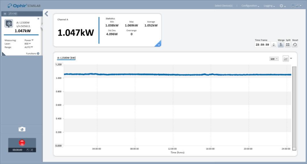 圖-3 1000W 單模光纖綠光24小時功率穩定性測試 ~0.4%@RMS 注:功率波動,主要受室內溫度影響。