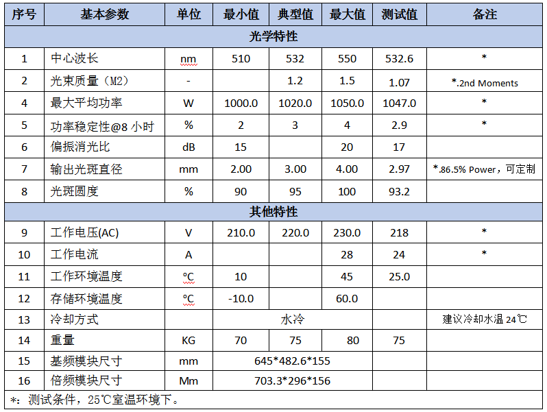 公大激光1000W單模連續綠光測試部分數據 PN:GCL-1000-F-S-W