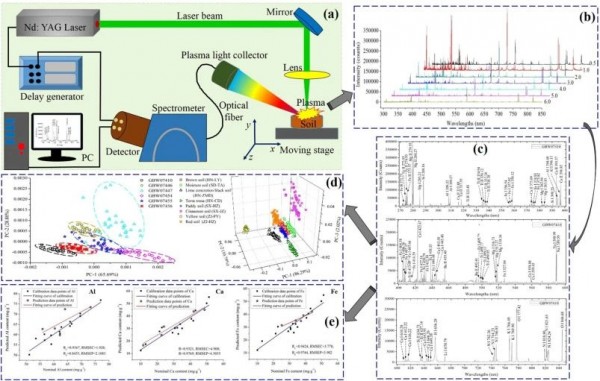 利用 LIBS 確定土壤類型和測量土壤中多種元素(如 Al、Ca、Fe)含量的過程。(a) 具有代表性的 LIBS 系統示意圖;(b) 采集的土壤 LIBS 數據;(c) 位于 LIBS 曲線上的土壤中幾種元素的特征發射線;(d) 利用 PCA 對土壤類型進行分類;(e) 利用 PLSR 預測土壤中 Al、Ca、Fe 的含量。資料來源:Keqiang Yu,Jie Ren,Yanru Zhao,《Principles, developments and applications of laser-induced breakdown spectroscopy in agriculture: A review》,《Artificial intelligence in agriculture》(2020)。