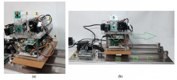 除草裝置的原型。(a) 1. 指向攝像頭;2.振鏡;3.樹莓派計算機;4.激光測距儀;5.激光器;6.電源;7.電機驅動器;8.電子信號處理板;9.控制激光裝置位置的 Arduino 板。(b) A、B 和 C 顯示了作物的位置。資料來源:Rakhmatulin, I.,  Andreasen, C.,《A concept of a compact and inexpensive device for controlling weeds with laser beams》,《Agronomy》(2020)。