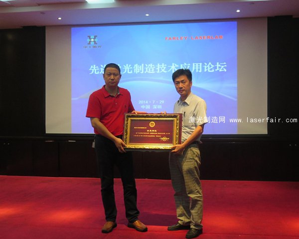 廣東省激光行業(yè)協(xié)會秘書長邵火為深圳華工激光設備有限公司頒發(fā)會員牌