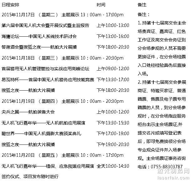 比參展技術和產品展覽展示更受觀眾矚目的,是高交會無人系統展分會場現場豐富多彩的大會交流、飛行競賽、動態展演及商務洽談活動。包括由“海鷹論壇——中國無人系統技術研討會”、“首屆警用無人機管理管控與實戰應用高峰論壇”、“尖兵之翼——航拍裝備大會”組成的第六屆中國無人機大會,由“易瓦特杯——首屆中國無人機警務應用技能競賽”、“無人機航拍應用展演”、“無人機植保應用展演”、“無人機應急救援應用展演”組成的飛行嘉年華,由“搜狐之夜航拍大片展播”、“瞰世界——首屆中國無人機攝影大賽頒獎典禮”組成的搜狐之夜,及“第二屆全國青少年太空畫獲獎作品展”等等。其中精彩的飛行競賽展演活動將亮相于深圳市龍崗區大運中心體育場副場飛行展演區。