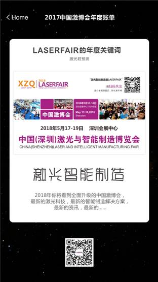 2017年悄然過去,支付寶的年度賬單火爆了朋友圈,這份賬單細(xì)數(shù)著你的點滴,也搭載著2018年的新希望伴您前行。2018中國(深圳)激光與智能制造博覽會(簡稱中國激博會)再起航,與您相約2018年5月17-19 日。