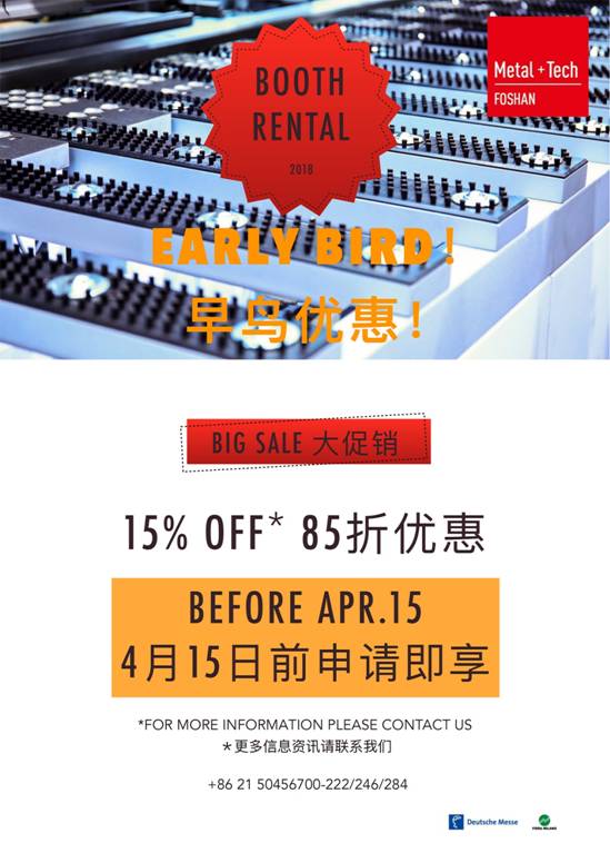 即日起至2018年4月15日之間申請展會即享8.5折優惠。(4月15日之后申請展位,一律不享受該優惠。)
